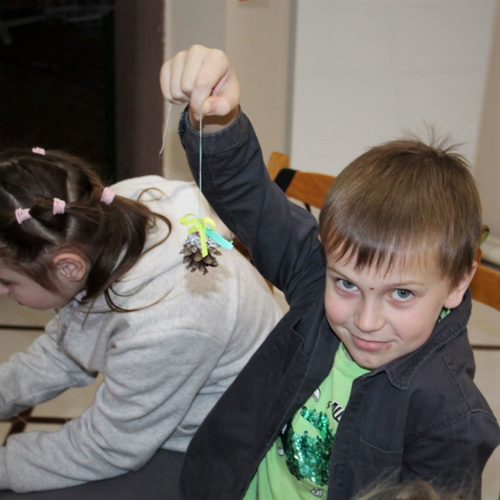 Напярэдадні зімовых святаў у кожнага з нас прачынаецца жаданне зрабіць сваімі рукамі ўпрыгажэнні на ёлку, стварыць сувеніры родным і сябрам. Таму ў Гудзевіцкім дзяржаўным літаратурна-краязнаўчым музеі прайшлі майстар-класы па вырабе ёлачных цацак з хваёвых шышак. Дзеці з задавальненнем акунуліся ў працу і ў ходзе майстар-класаў прыгожа аформілі шышкі.